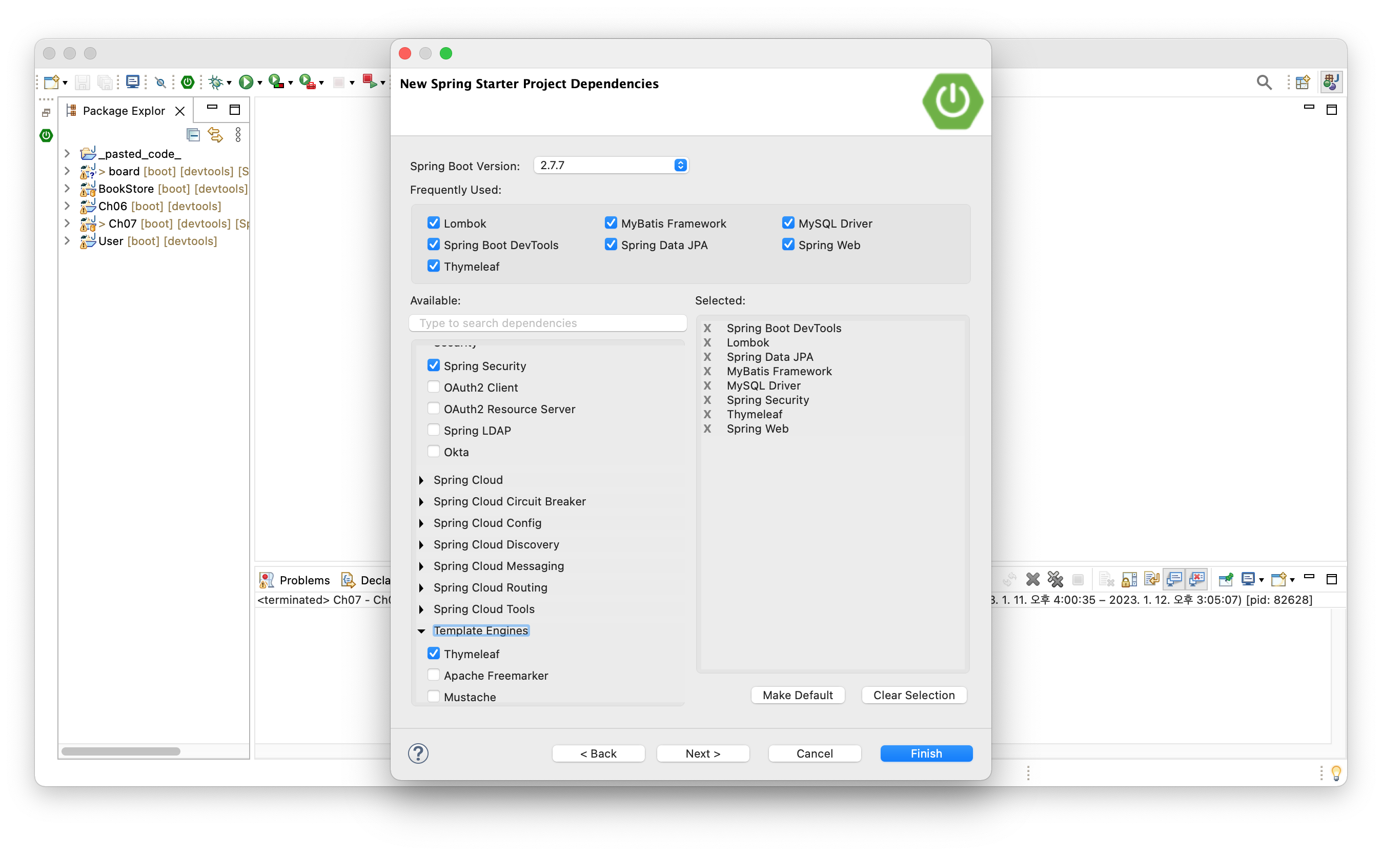 - Selected: Lombok, MyBatis FrameWork, MySQL Driver, Spring Boot DevTools, Spring Web, Spring Data JPA, Thymeleaf, Spring Security
