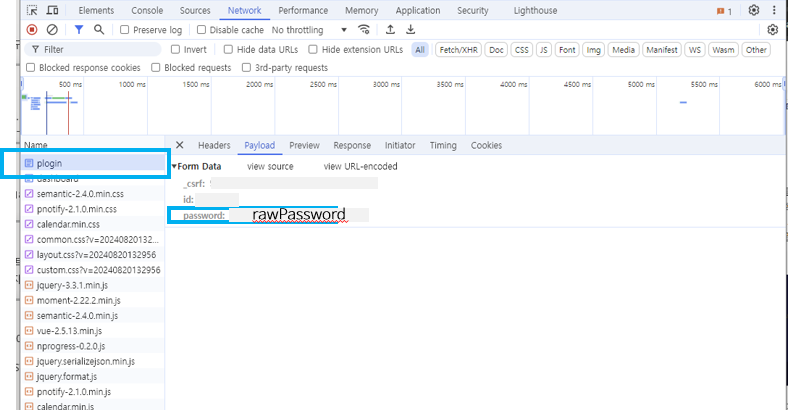 문제: 로그인 시 개발자 도구의 페이로드에 패스워드가 평문으로 노출되고 있다.