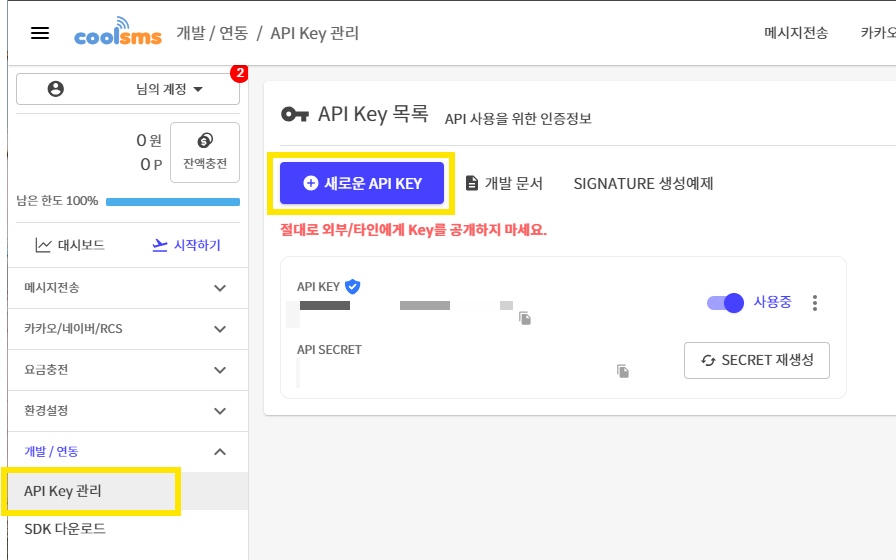 개발/연동 > API Key 관리에서 새로운 API KEY를 생성한다.
