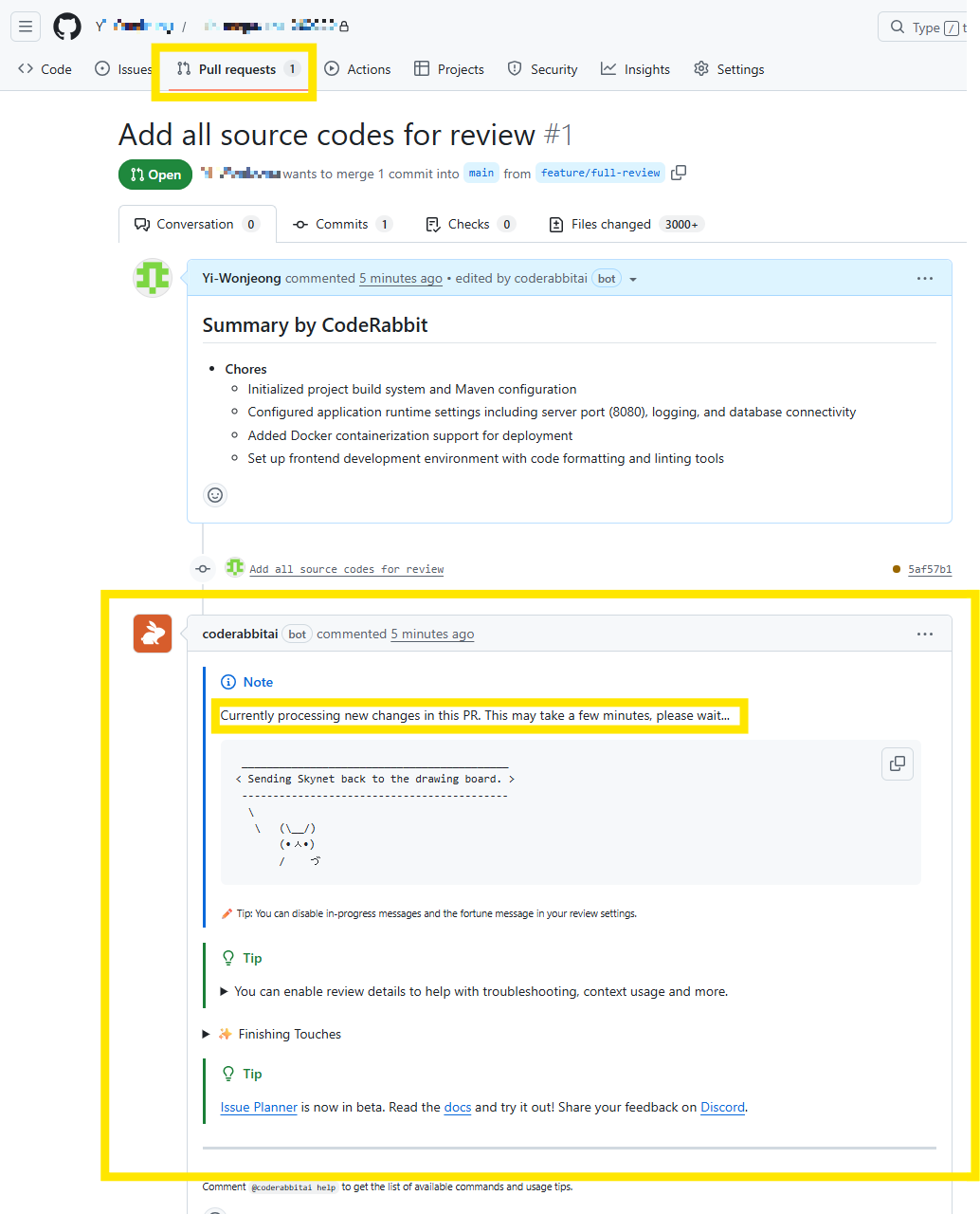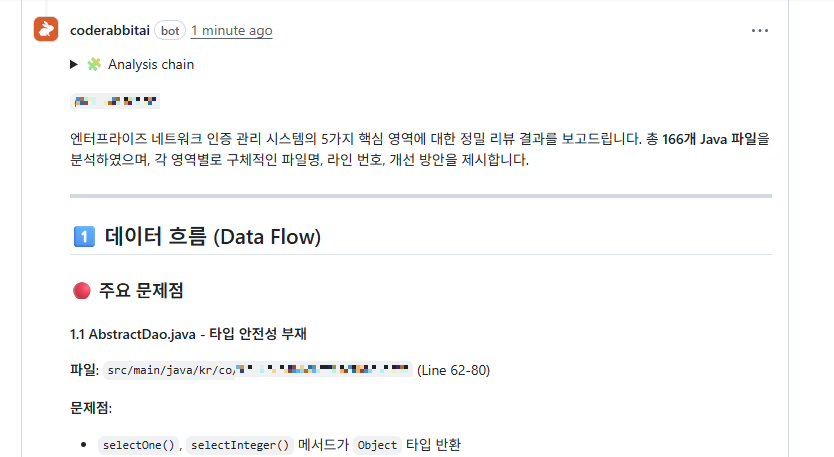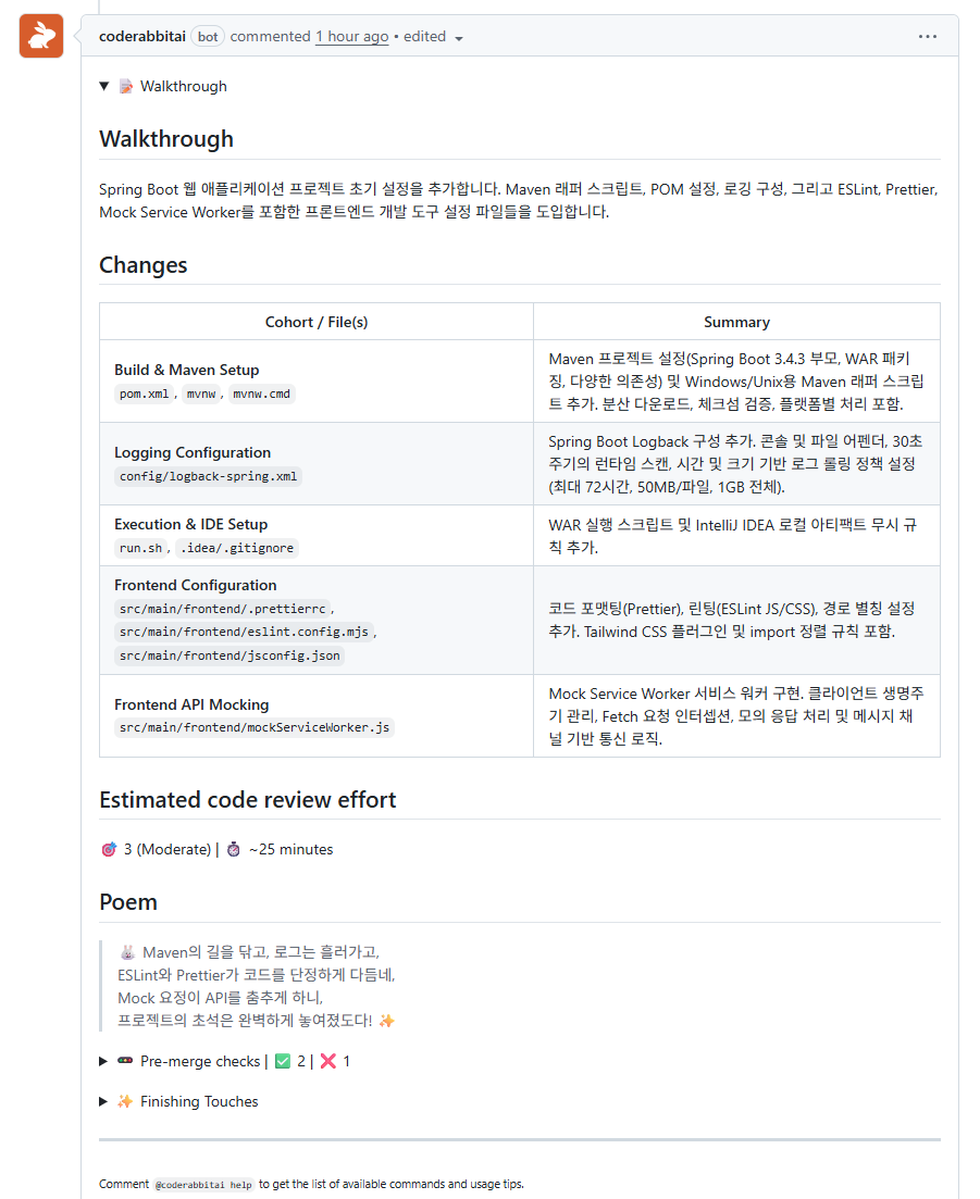 아래로 좀 더 스크롤하면 이제부터 CodeRabbit의 코드 리뷰가 시작됩니다.