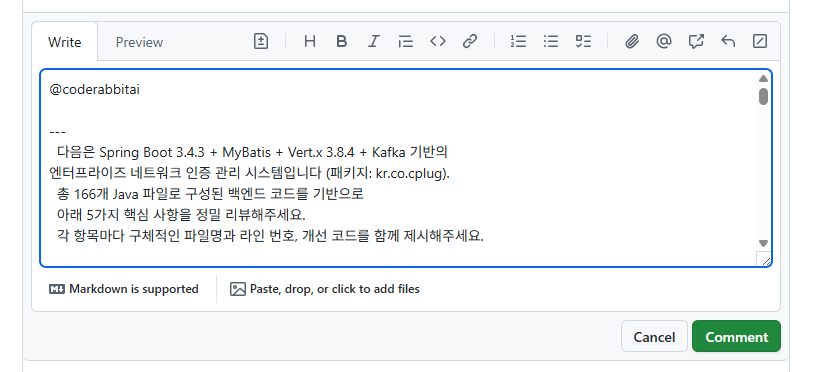 - GitHub에 Pull Request를 올리면 AI가 라인 단위로 코드 리뷰를 합니다.