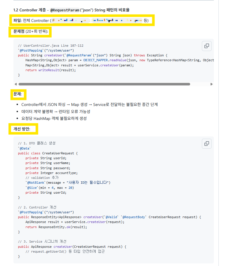 각 항목마다 구체적인 파일명과 라인 번호, 개선 코드를 함께 제시해주세요.