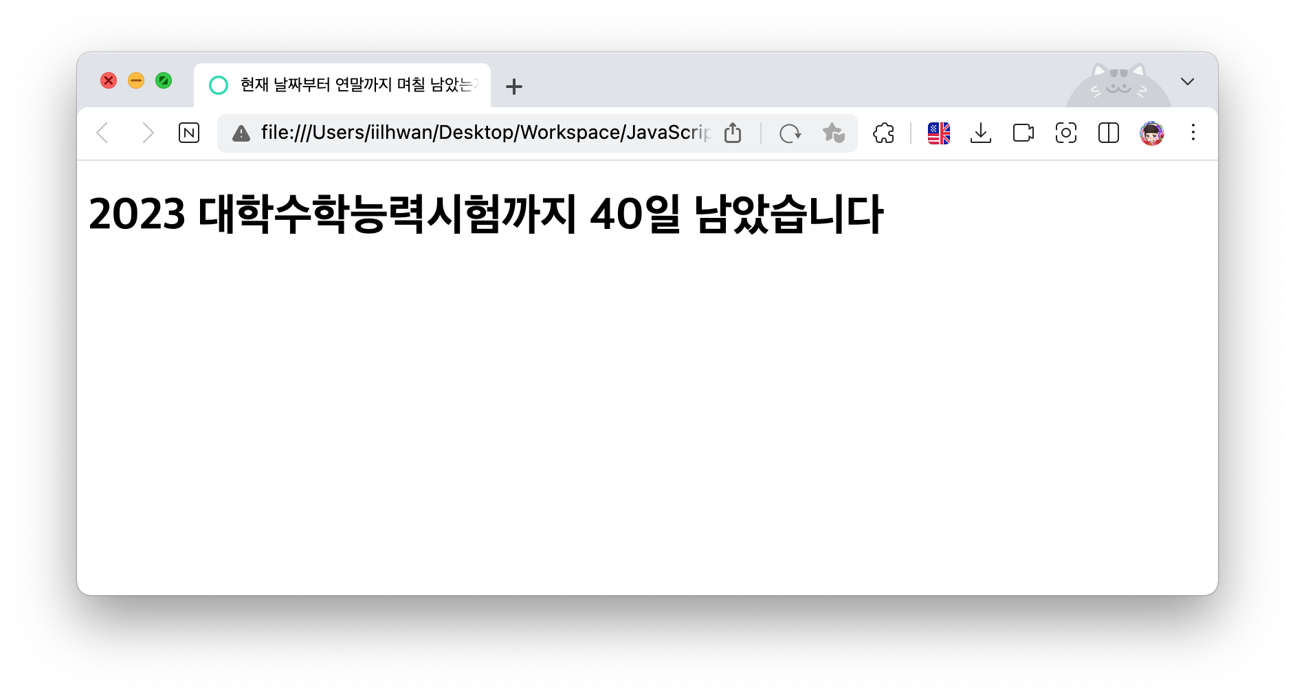 document.write("<h1> 2023 대학수학능력시험까지 " + result + "일 남았습니다 </h1>");
